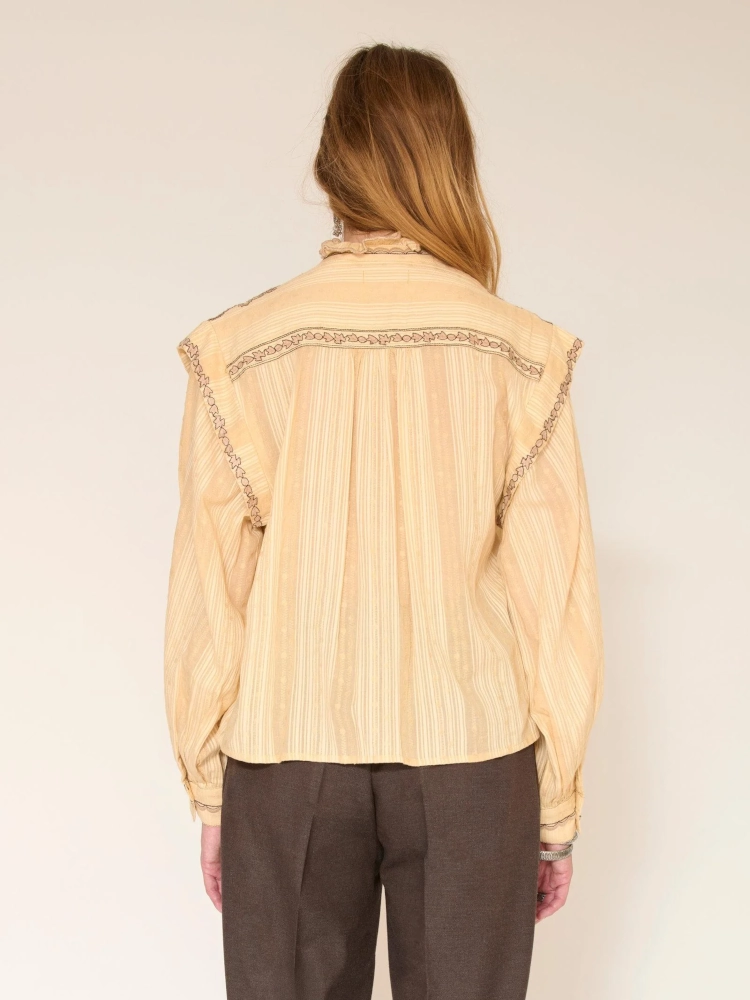 La blouse CAMELITA NUDE se démarque par son élégance et sa couleur douce, parfaite pour ajouter une touche de sophistication à votre garde-robe. Sa teinte peau, associée à des motifs de rayures délicates, apporte une texture subtile qui enrichit son design.