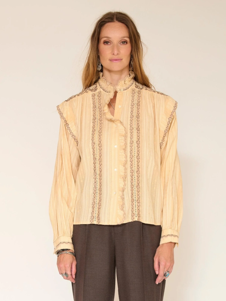 100% coton pour un confort optimal tout au long de la journée. Sa coupe ample et ses manches longues lui confèrent une silhouette flatteuse, tandis que les volants au niveau du col tunisien et des épaules ajoutent une dimension romantique et féminine.