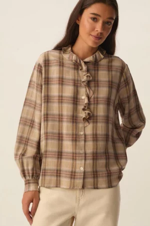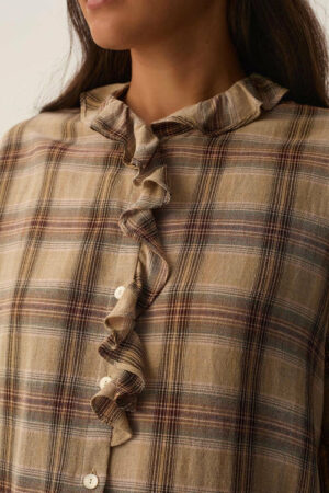La blouse COSIMA CAMEL se distingue par son design élégant et ses motifs floraux dans des tons chauds de camel et de vert. Cette pièce unique apporte une touche de sophistication à toute garde-robe.