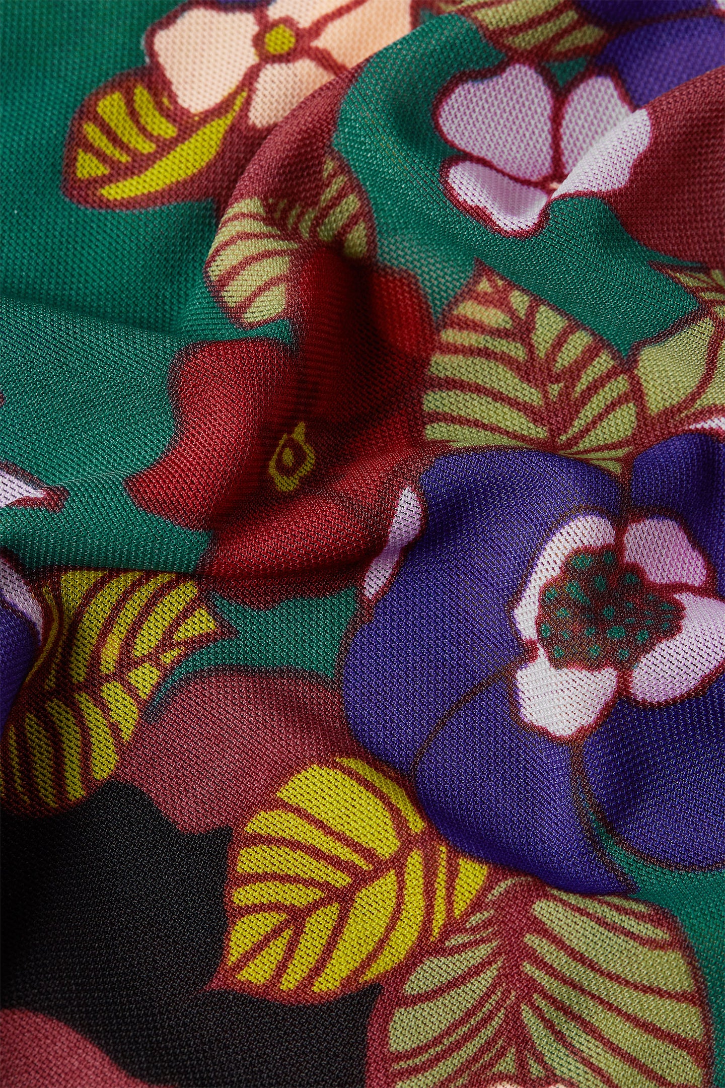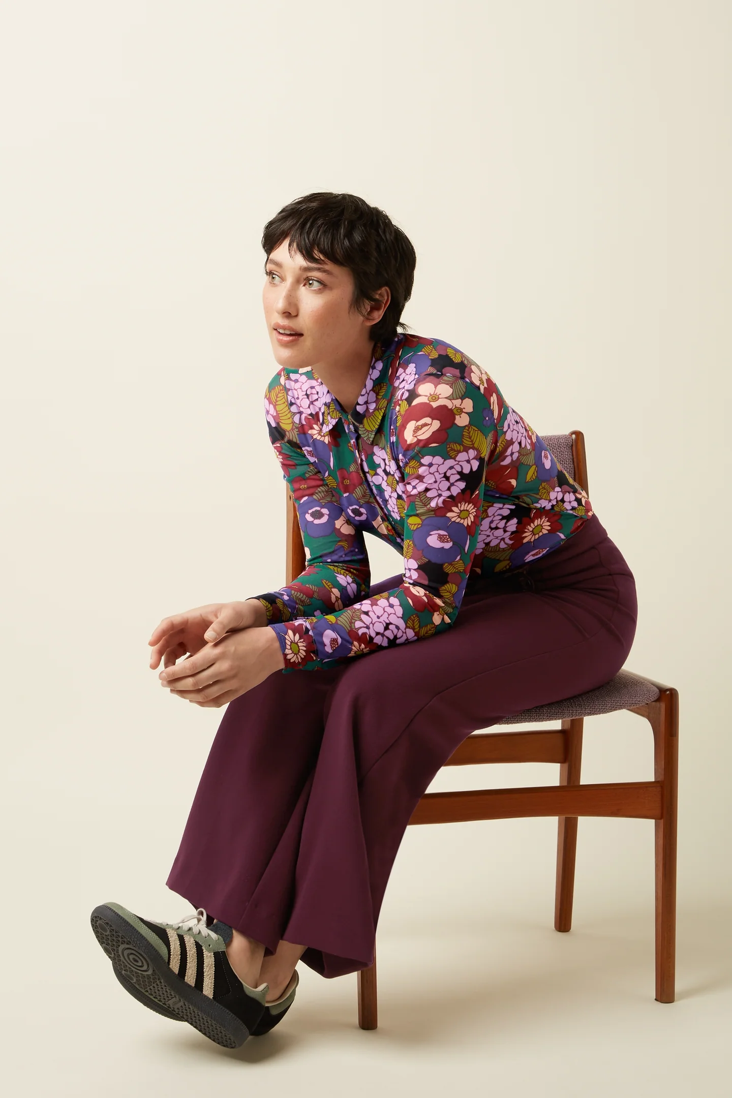 Cette blouse est confectionnée dans une maille polyamide semi-transparente à motif floral et extensible pour plus de confort. Elle présente des manches longues à poignets, un col classique et une fermeture à boutons pour un style facile à porter.