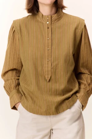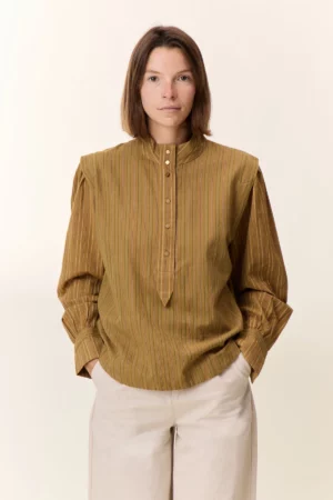 Douceur d’un tissu en viscose et laine, élégance rétro d’un motif carreau, la blouse Tessa gagne en originalité avec son col volanté. Un modèle casual chic à porter avec un jean écru et des mules pour une silhouette folk urbaine.