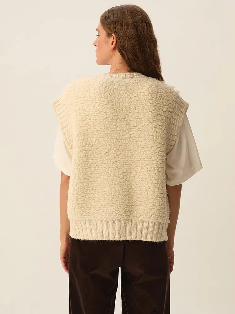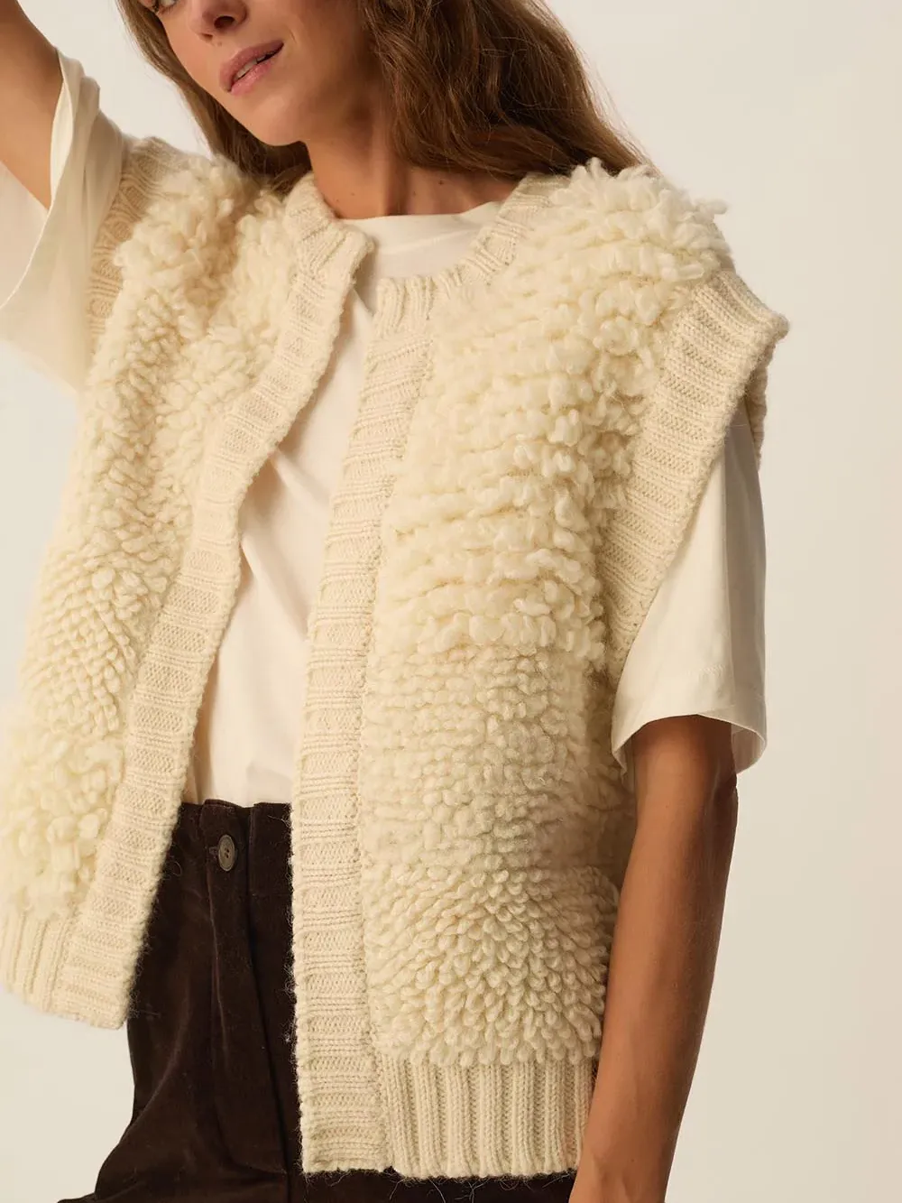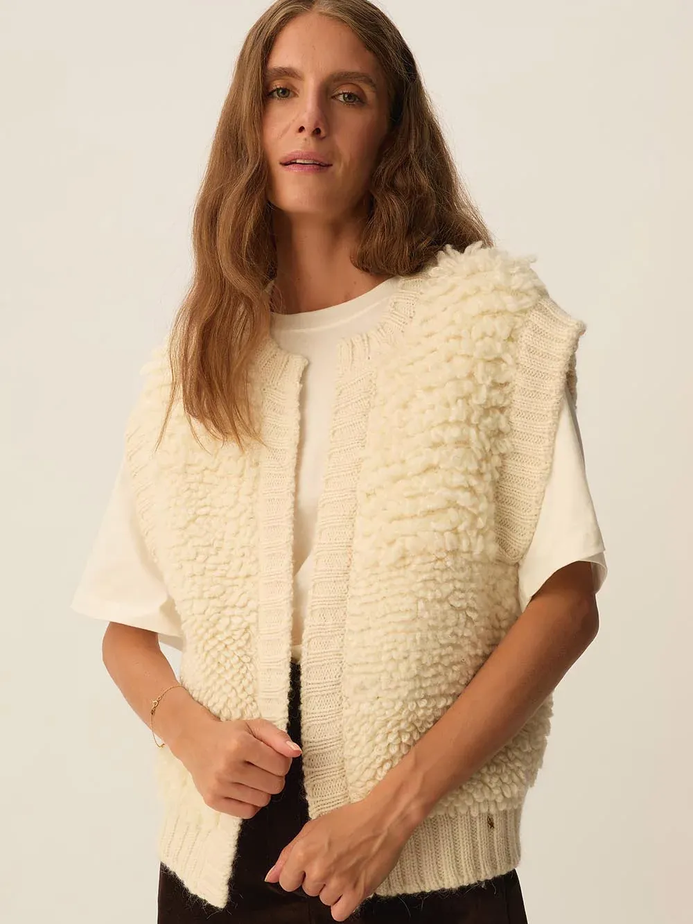 Le gilet sans manches Bongo sort des sentiers battus et opte pour un tricotage fourrure et bouclette au relief irrésistible. Une pièce cosy et bohème résolument dans l’air du temps qui s’envisage sur tous les looks.